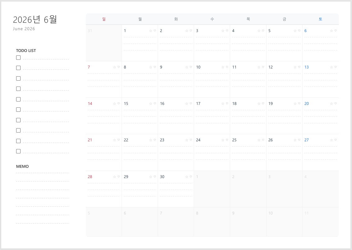 각 날짜 칸의 줄에 일정이나 메모를 작성하세요. 중요한 날은 별(☆)이나 하트(♡) 아이콘을 체크해서 표시할 수 있어요.