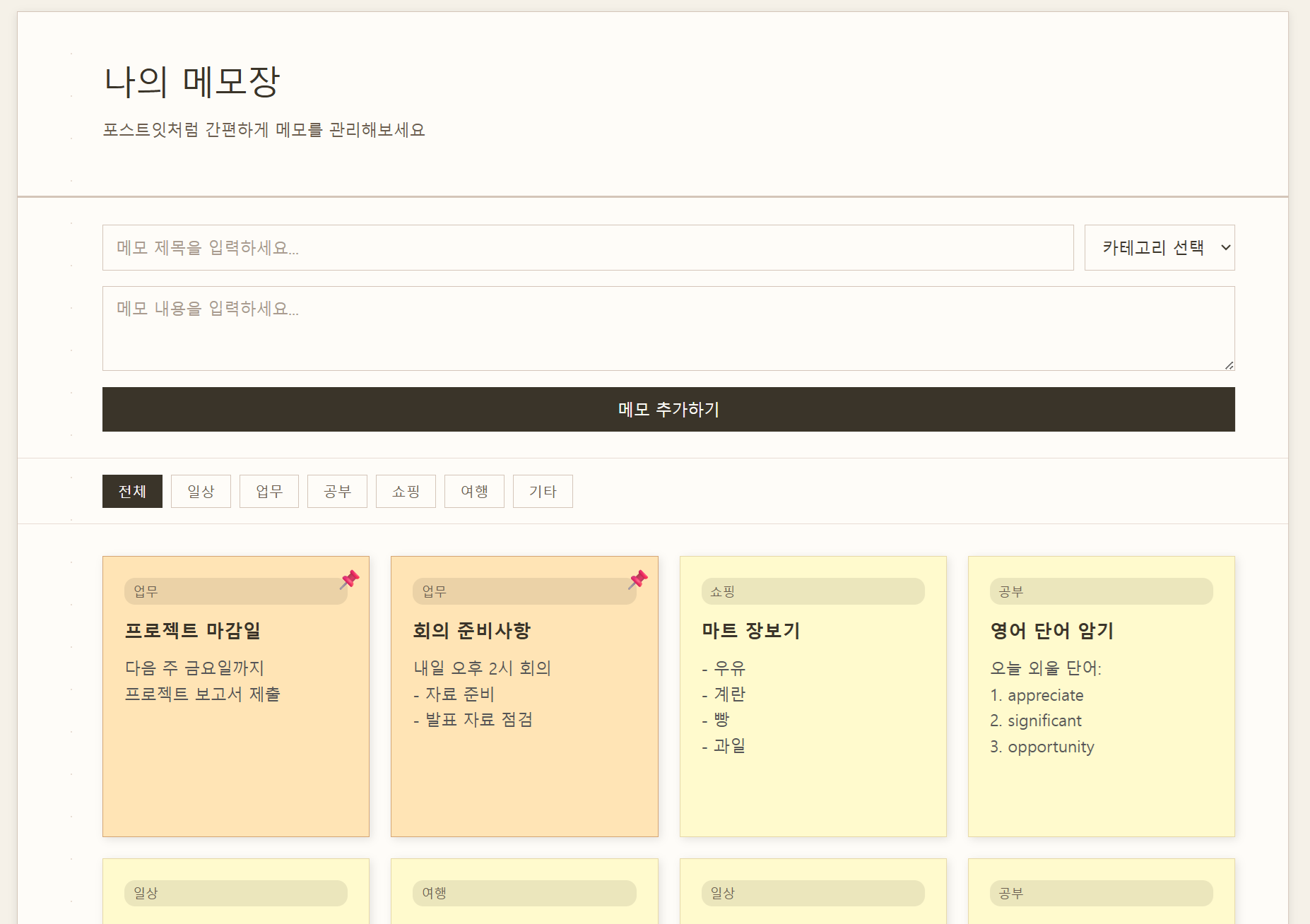 상단의 필터 버튼(전체/일상/업무/공부/쇼핑/여행/기타)을 클릭하여 원하는 카테고리의 메모만 볼 수 있습니다.