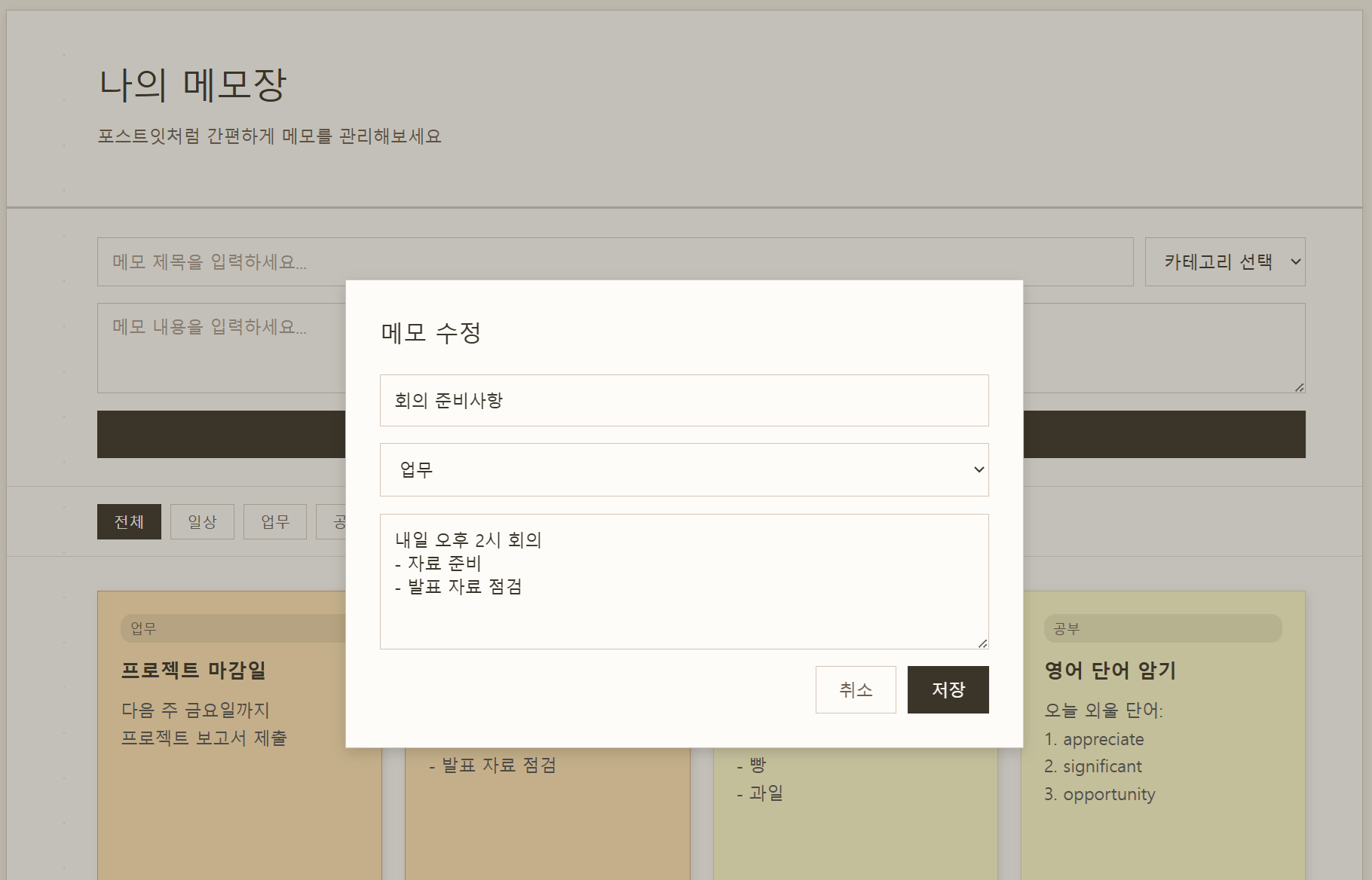 각 메모에 마우스를 올리면 "수정"과 "삭제" 버튼이 나타납니다. 수정 버튼을 클릭하면 모달 창이 열려 메모의 제목, 내용, 카테고리를 변경할 수 있습니다.