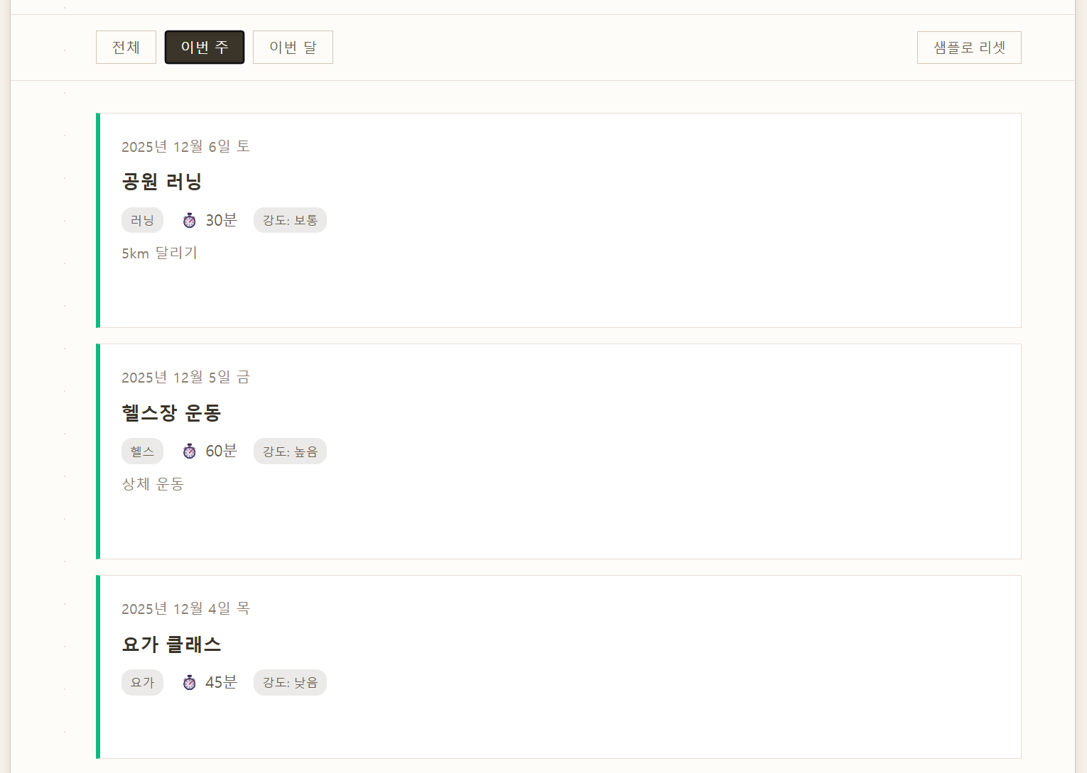 상단의 필터 버튼으로 전체, 이번 주, 이번 달 운동 기록만 볼 수 있습니다. 이번 주 필터를 사용하면 주간 운동 목표 달성 여부를 쉽게 확인할 수 있습니다.