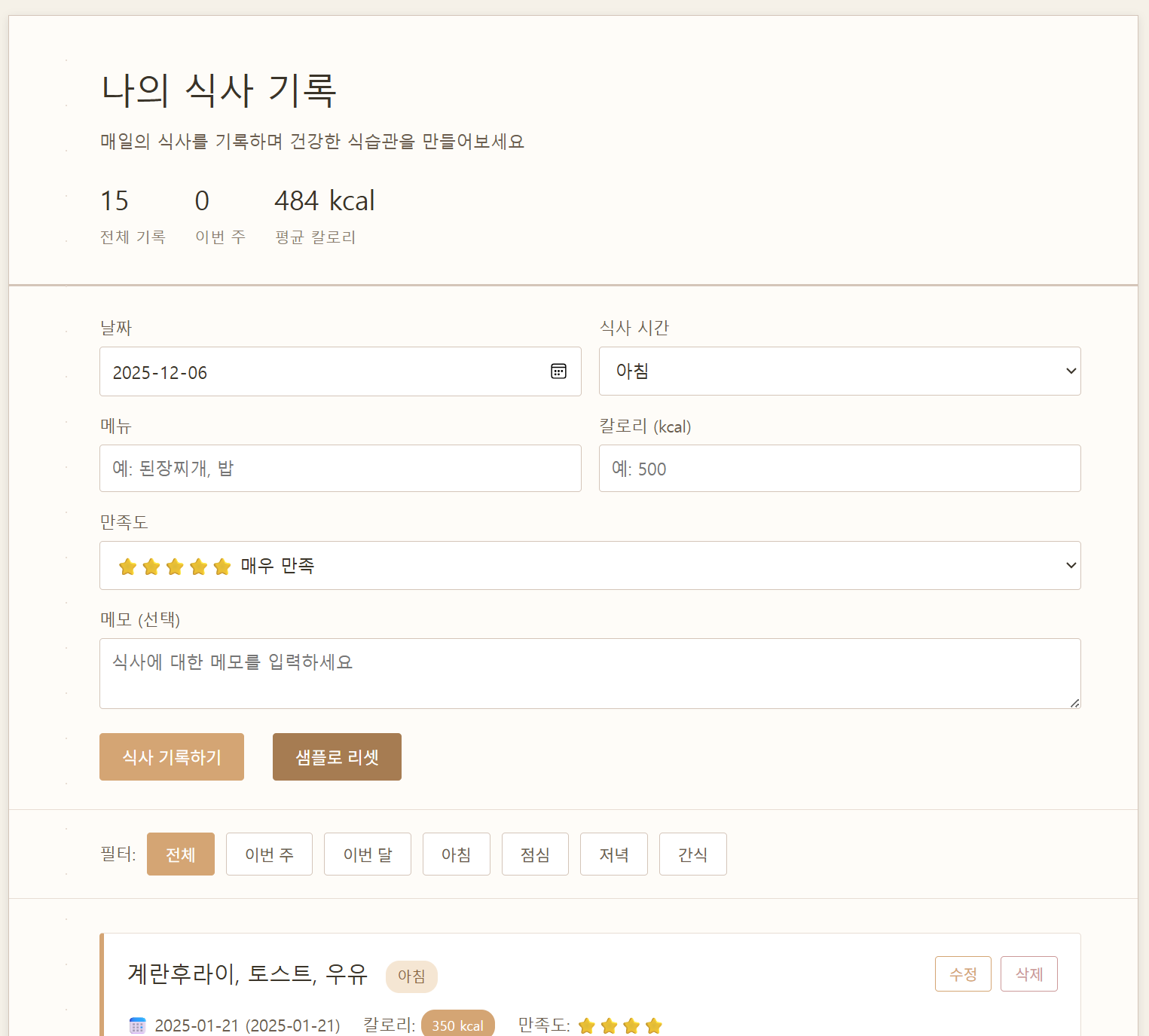 상단의 입력창에서 날짜, 식사 시간, 메뉴를 입력하고, 칼로리와 만족도를 선택한 후 "식사 기록하기" 버튼을 클릭하면 됩니다. 식사 직후 바로 기록하는 습관을 만들면 더욱 정확한 기록이 가능합니다.